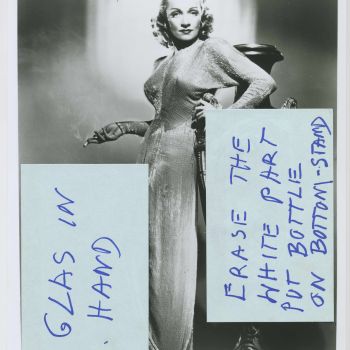 Werbefoto, entstanden im Kontext der Filmproduktion ›The Lady is Willing‹ (USA 1941, Regie: Mitchell Leisen). Die handschriftlichen Anmerkungen zur Bearbeitung der Fotografie von Marlene Dietrich stammen aus den 1980er-Jahren.