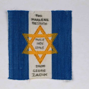 Fangeschenk an Marlene Dietrich: Aufnäher mit Davidstern und der Widmung »For Marlene Dietrich – Paris Nov. 1945 – from Georg Zadik«