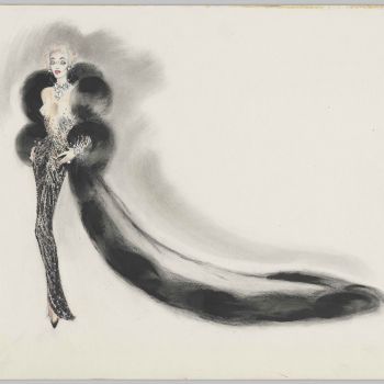 Kostümentwurf eines schwarzen mit Strass und Pailletten bestickten Showkleides mit Mantel und Pelzbesatz, Los Angeles, etwa 1953. Das von Elizabeth Courtney gefertigte Kostüm trug Marlene Dietrich zu ihrem ersten Engagement in Las Vegas 1953.