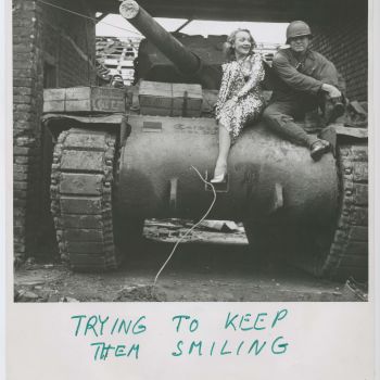 Marlene Dietrich im Auftrittskostüm auf einem Panzer der US-Amerikanischen Streitkräfte in Gillrath bei Geilenkirchen im Februar 1945. Die handschriftlichen Anmerkungen von Marlene Dietrich stammen aus den 1980er-Jahren.