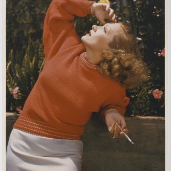 Marlene Dietrich in einem roten Strickpullover von Kniže, Los Angeles, 1940