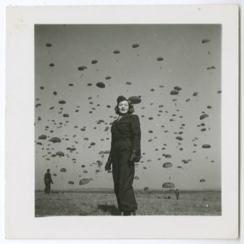 Marlene Dietrich beim Fallschirmübungsspringen der 82. Airborne Division, Soissons in Nordfrankreich, 13. März 1945