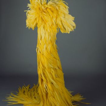 Showmantel aus gelben Hahnenfedern, Dreher mit bis zu 60cm langen Federn eng besetzt, getragen zu einem mit gelb schimmernden Strasssteinen besetzten Showkostüm