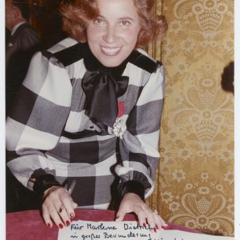 Widmungsfotografie von Beate Klarsfeld vom 8. August 1985: »Für Marlene Dietrich in großer Bewunderung für die mutige Anti-Nazi Kämpferin und großartige Schauspielerin«. Die deutsch-französische Journalistin Beate Klarsfeld wurde selbst für ihr Engagement bei der Verfolgung und Aufklärung von NS-Verbrechen bekannt. Das Foto zeigt Beate Klarsfeld nach der Ernennung zum Ritter der Ehrenlegion (Chevalier de la Légion d’Honneur) am 2. Oktober 1984 in Paris.