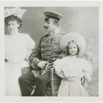 Familienfoto der Familie Dietrich mit Mutter Josefine Wilhelmine Elisabeth, Vater Louis Erich Otto Dietrich und der Tochter Marie Magdalene genannt Marlene. Links von der Mutter abgeschnitten war ursprünglich ihre knapp zwei Jahre ältere Schwester Elisabeth Ottilie Josefine Dietrich zu sehen, Berlin, 1906. Auf der Rückseite handschriftlich von Marlene Dietrich vermerkt: »Ma Mère / Mon Pere / et moi« (Meine Mutter / Mein Vater / und ich)