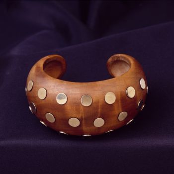 Sandelholzarmreif mit Goldplättchen, hergestellt von Joallier René Boivin, Paris, 1933. Der Armreif war ein Geschenk des Pariser Polizeipräfekten Jean Chiappe für Marlene Dietrich und trägt die Inschrift: »Á Marlene Dietrich la Police de Paris reconnaissante, le Préfeto Jean Chiappe, 13 / 6 / 33«
