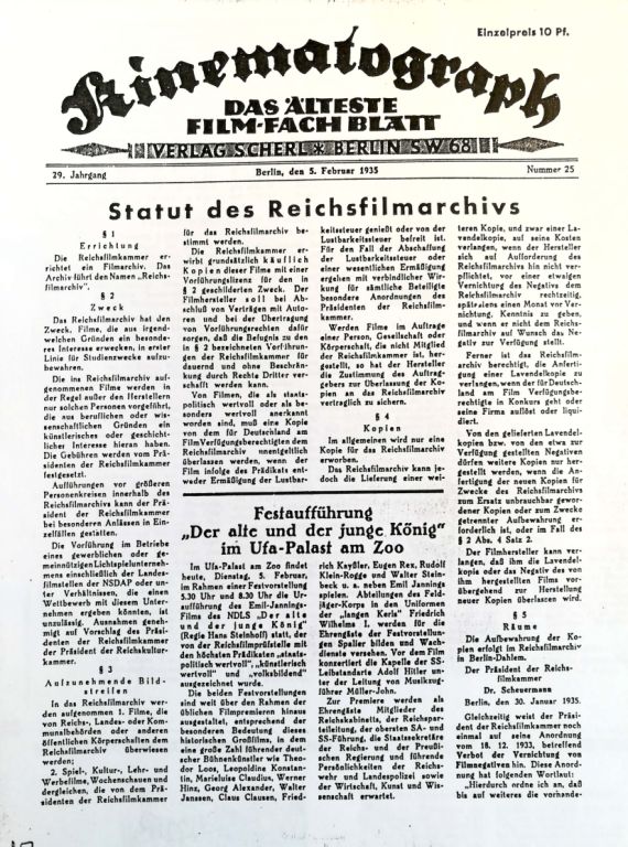 Statute of the Reichsfilmarchiv, published in the Kinematograph on 2/5/1933, source: SDK Library