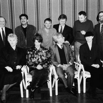 Heinz Rathsack (links hinten) als Teil der Jury der Internationalen Filmfestspiele Berlin 1988, weitere Jurymitglieder sind stehend Daniel Schmid, Heiner Carow, Eberhard Junkersdorf, Tom Luddy, Pavlos Zannas, sitzend: Anna-Lena Wibom, Ellen Burstyn, Guiglielmo Biraghi und Tilda Swinton