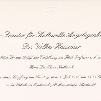 Einladung zu einem Empfang aus Anlass der Verleihung des Titels Professor e. h. an Heinz Rathsack am 5. Juli 1987