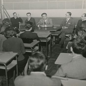 Centro Sperimentale di Cinematografia, Rom, Federico Fellini bei einer Gastvorlesung, Fotodokument von Heinz Rathsacks Recherchereise für die 1964 erschienene Studie »Vier Filmhochschulen«