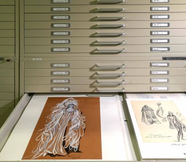 Das Spektrum der Kostüm- und Szenenbildentwürfe reicht von Kostümfigurinen und Trickbildern zu Fritz Langs ›Metropolis‹ (D 1927) bis hin zu umfangreichen Materialien für Tom Tykwers, Henk Handloegtens und Achim von Borries' Serie ›Babylon Berlin‹ (D ab 2017). Besonders erwähnenswert ist das mehr als 6000 Zeichnungen und Skizzen umfassende Archiv des Production Designers Sir Ken Adam (1921–2016). Der gebürtige Berliner Ken Adam hat mit seinen stilprägenden Sets, unter anderem für James-Bond-Produktionen oder den Regisseur Stanley Kubrick, Film- und Designgeschichte geschrieben.