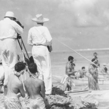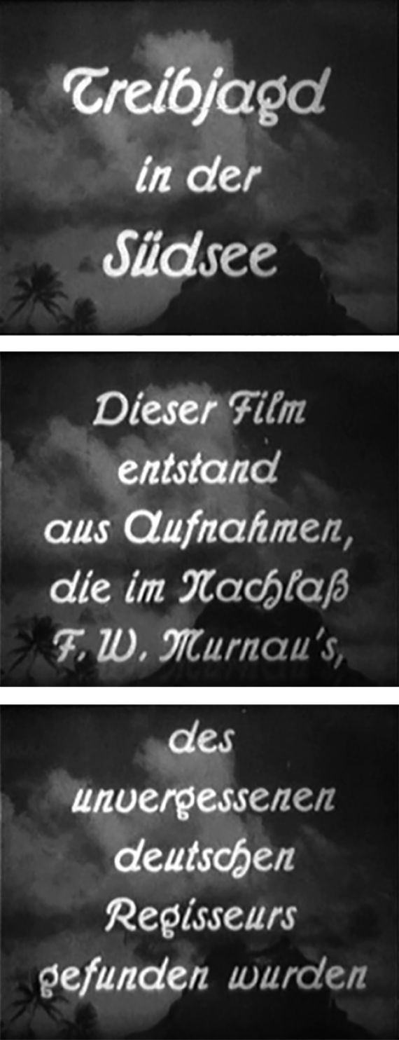 Von da an beschränkte sich Robert Flahertys Mitwirkung an der Produktion auf das Entwickeln der Negative und das Kopieren der Muster auf Positivfilm [vgl. R. Flaherty: Wie Tabu entstand. In: Die Filmwoche, Nr. 22, 27.5.1931]. Diese Arbeit wurde vor Ort mit Geräten der Firma Steinman durchgeführt, die nach dem Ende der Dreharbeiten zu ›White Shadow in the South Seas‹ (USA 1928) auf Tahiti geblieben waren [vgl. Floyd Crosby: The Development of Cinematography, T2, S. 59f]. Robert Flaherty war als Koregisseur an White Shadows beteiligt gewesen, hatte seine Mitarbeit aber vorzeitig aufgegeben, Crosby war bei dieser Produktion zeitweise als Kameraassistent tätig gewesen.
