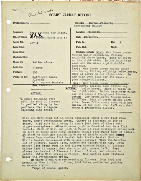 Flaherty zog sich – möglicherweise auch aufgrund der technischen Probleme, die er mit seiner »Akeley« hatte – immer mehr aus der Kameraarbeit zurück. Der Bericht vom Nachmittag des 14. März 1930 verzeichnet seinen letzten Dreh: Kanus werden am Strand von Motu Tapu mit Obst und anderen Abschiedsgeschenken für Hitu beladen, bevor dieser Reri mit sich nimmt.
