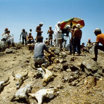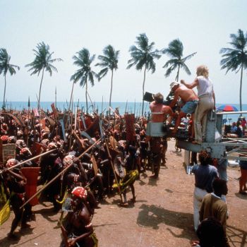Standing on a camera crane: Klaus Kinski; below: Werner Herzog | Behind the scenes